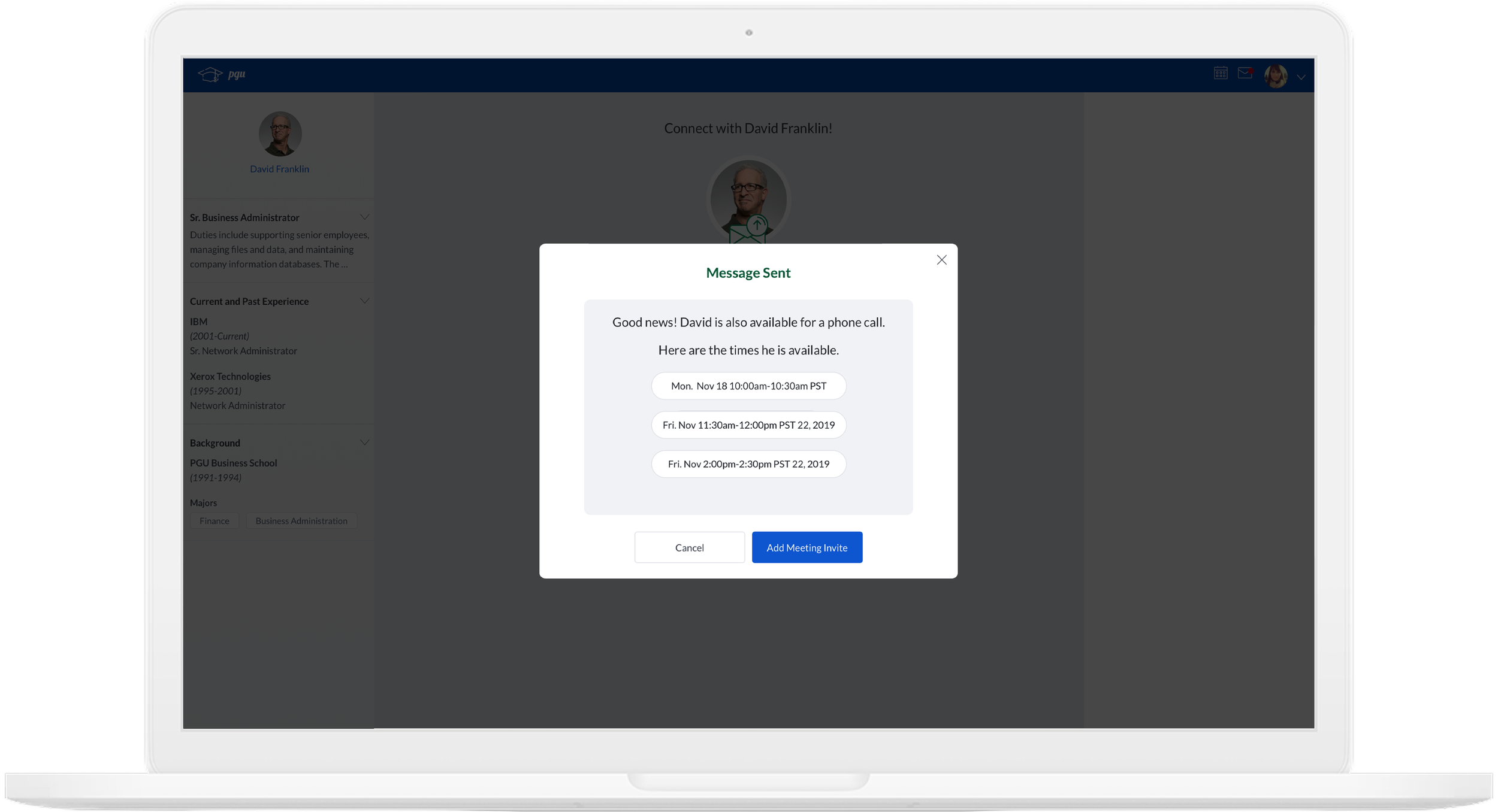 This approach involved the student user type first sending a message to an alumni user type and then afterwards seeing a modal with a confirmation of the email being sent and suggesting the user additionally request a meeting.